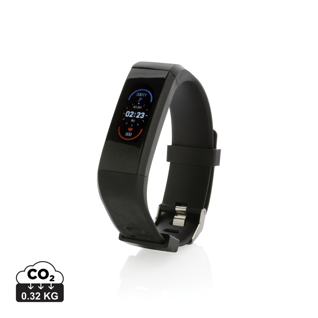 Ta hand om din hälsa med detta vattentäta (IPX5) aktivitetsarmband med bekvämt armband i återvunnen TPU så att det kan bäras både på dagen och natten. Lättnavigerad 0.96” touch OLED färgskärm. Tillverkad av RCS (Recycled Claim Standard) certifierad återvunnen TPU (armbandet) och ABS (ramen). Totalt återvunnet innehåll: 35% baserat på total produktvikt. RCS certifiering säkerställer en helt certifierad leveranskedja av de återvunna materialen. Med gratis APP på 6 språk så att du kan följa dina framsteg (för iOS 8.1 och Android 4.4 eller senare). BT 5.0. funktioner inkluderar: sömnregistrering, stegräknare, distans, kaloriräknare, pulsmätare, blodtrycksmätare, mäter syresättning av blodet, Multi-sport läge (11) och kamerakontroll. Standby-tid är 15 dagar och arbetstid på upp till 7 dagar. Levereras i FSC ® mix kraft förpackning. Produkt och accessoarer är 100% PVC-fria.