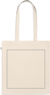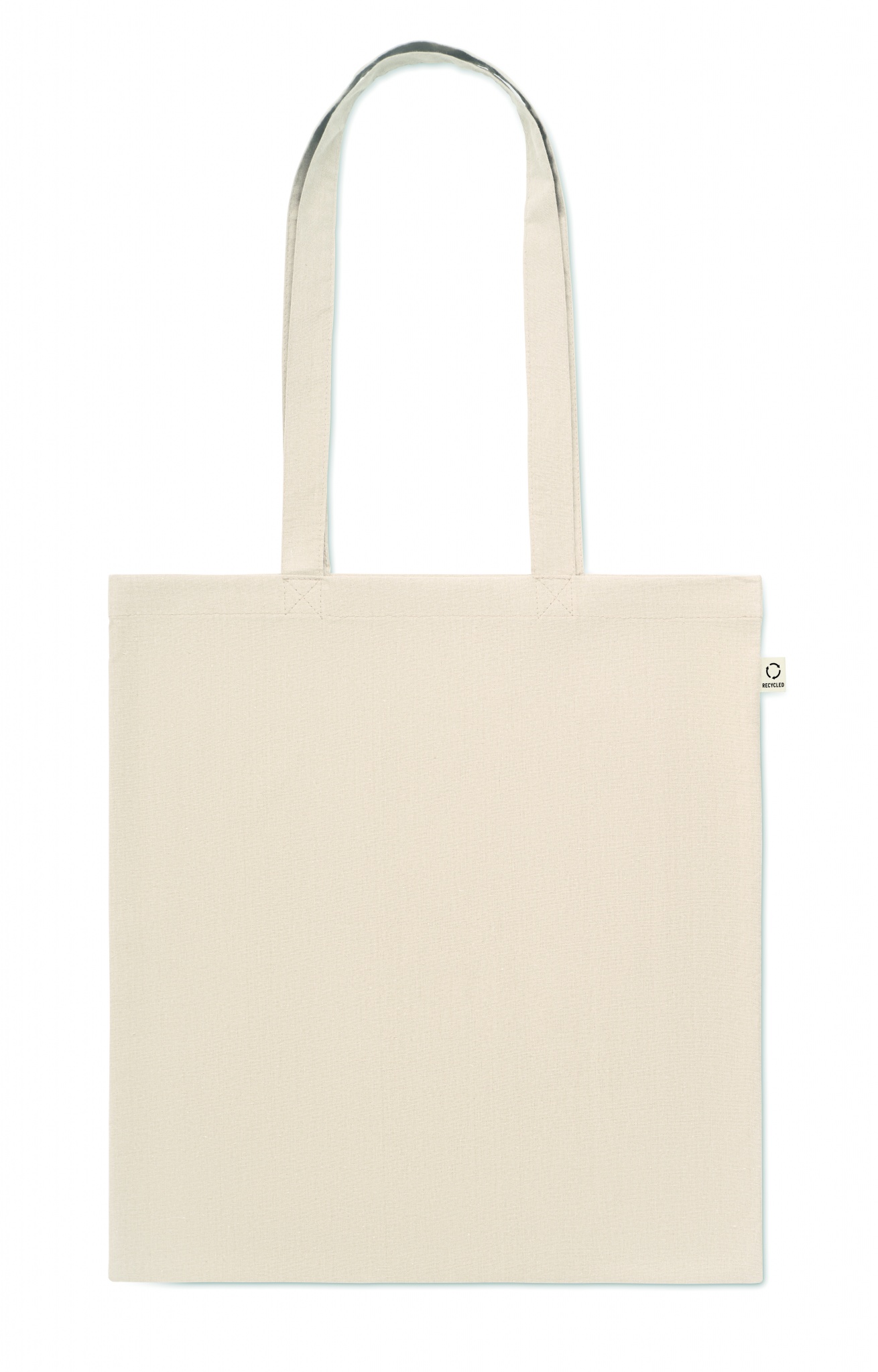 Kasse av återvunnen bomull (70% återvunnen bomull och 30% RPET) med långa handtag. 140 gr/m².
