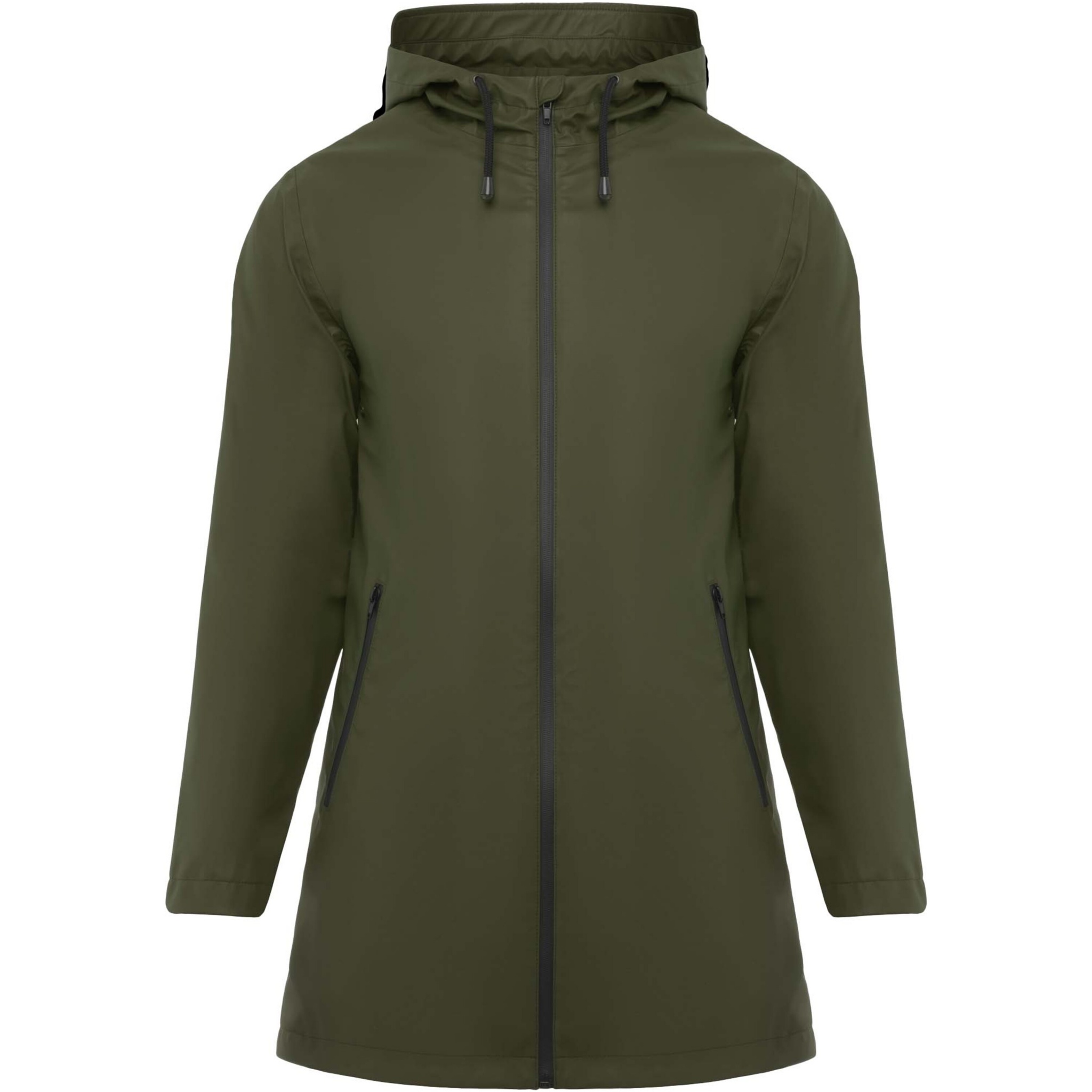 Vattentät regnjacka för dam. Huva med topp. Värmeförseglade dragkedjor och sömmar. Kontrasterande detaljer i svart. Två sidfickor med dragkedja. Slits i bakre fållen. Borttagbar etikett. Vattentät. Modellen är 179 cm och bär storlek S.
