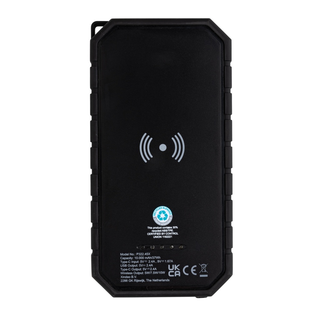 Snabb 10.000 mAh solcellspowerbank med 10W trådlös laddning tillverkad av RCS (Recycled Claim Standard) certifierad återvunnen ABS och TPE. Totalt återvunnet innehåll: 30% baserat på total produktvikt. RCS certifiering säkerställer en helt certifierad leveranskedja av de återvunna materialen. Powerbanken stödjer laddning både via kabel (type C och USB) och 10W trådlös snabbladdning. Trådlös laddning är kompatibel med alla QI-aktiverade enheter som senaste generationen Android, iPhone 8 och upp. Den har en solscellspanel, ficklampa och karbinhake. IPX5 vattentät. Med batteriindikator. Type C laddningskabel i GRS certifierad återvunnen TPE medföljer. Levereras i FSC® mix kraft förpackning. USB Output: 5V/2.4A; Type C Output: 5V/2.4A. Produkt och accessoarer är 100% PVC-fria.