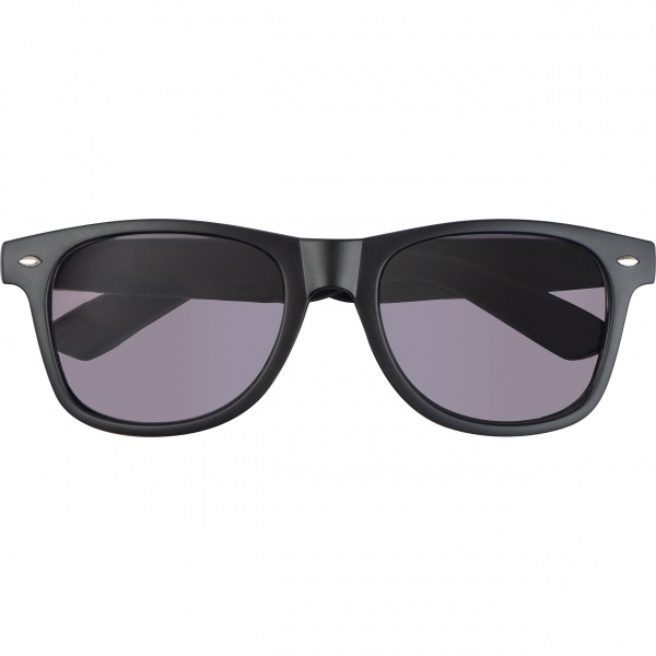 Svarta, klassiska solglasögon med UV 400-skydd, filterkategori 3, högkvalitativ plastbåge och skalmar i korklook. Din logotyp kommer att tryckas på en hängare.