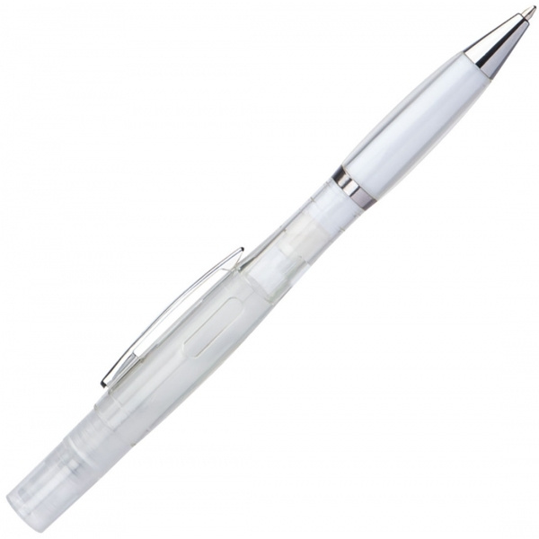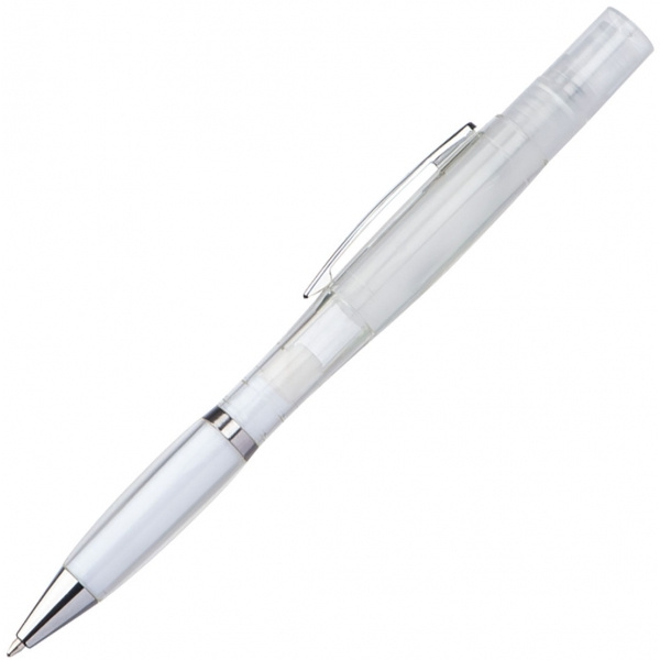Genomskinlig Twistpen med silverapplikationer och blåskrivande refill. Sprutan är påfyllningsbar - perfekt för parfym eller desinfektionsvätskor. Vi trycker din logotyp på höger sida av klämman.