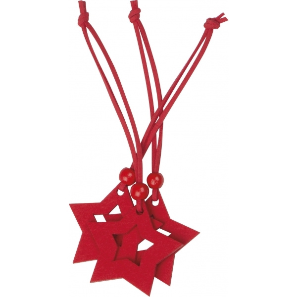 Set med tre röda filtstjärnor med snöre och träpärla, dekorativa inte bara för julen. Din logotyp kommer att appliceras på den individuella förpackningen med etikett.