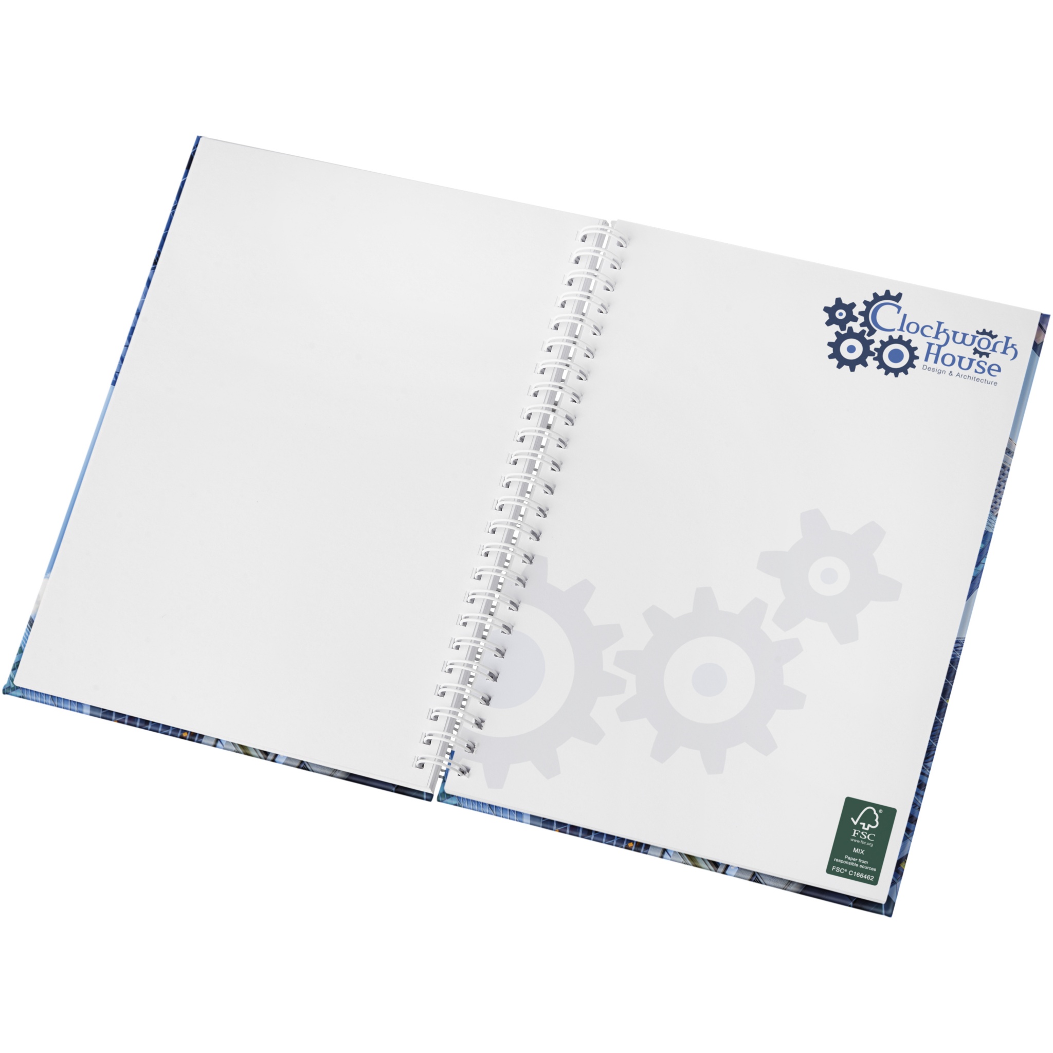 Wire-o A5 anteckningsbok med hårt omslag. Inklusive 80 ark (80 g/m2) blankt papper och blanka sidor. Tillgänglig i 3 storlekar; A4, A5 och A6. Fullfärgsdekoration är möjlig på omslaget och arken på både fram och baksidan. Papper, nylon.